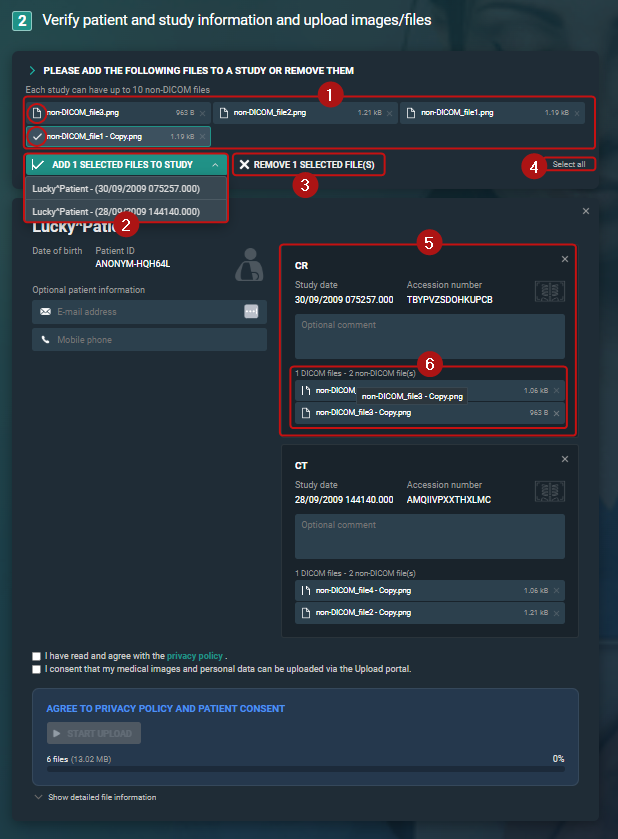 6 | Start upload | This button initiates the upload. It is not available until you have agreed to the privacy policy and patient consent. |
