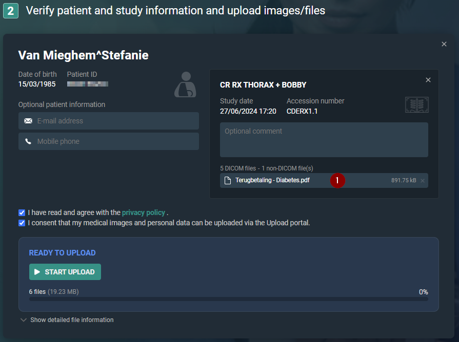 5 | Privacy policy & patient consent | These are mandatory fields. You must agree to the privacy policy and consent to sharing your medical images and personal data with the hospital via the upload portal. |